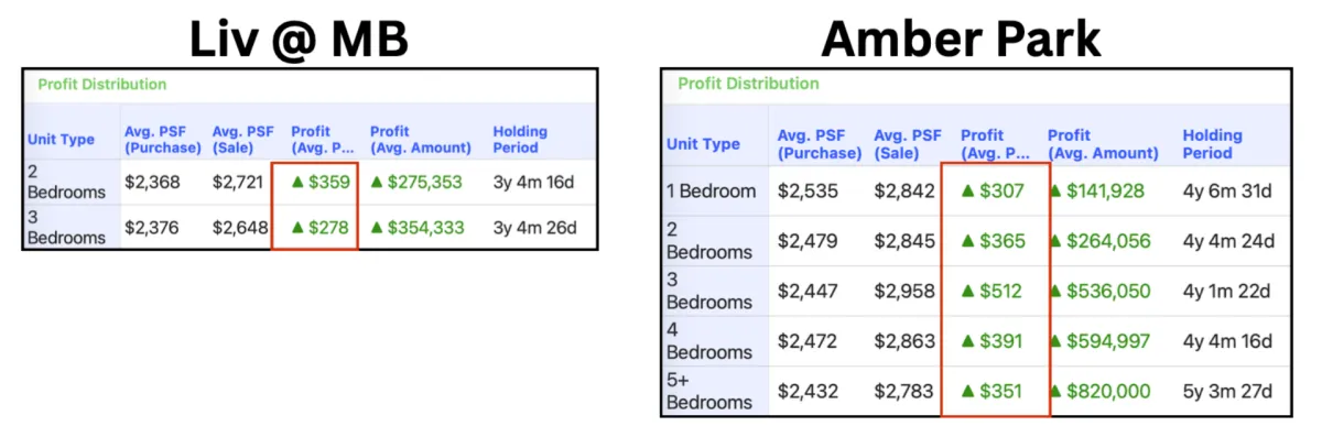 Amber Park averaged $264K–$536K. Good numbers. But they entered at $2,368–$2,479 psf versus Woodleigh's $1,733 psf.
